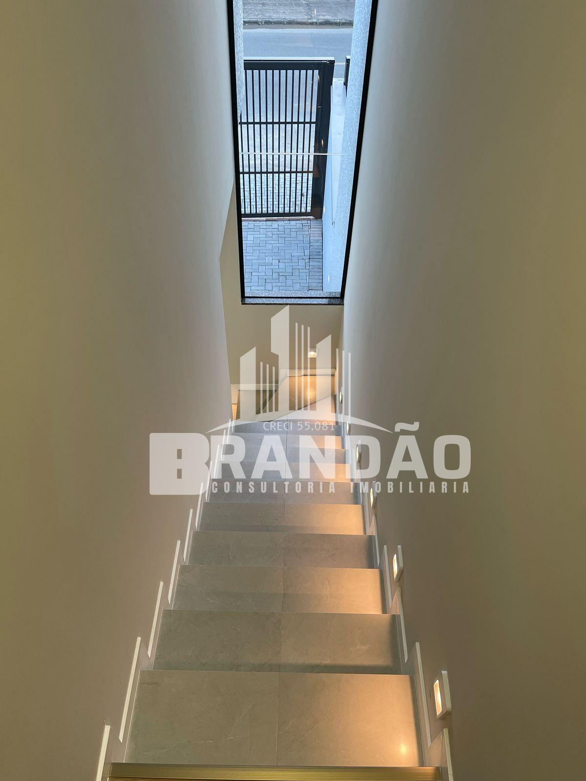 Acabamentos: porcelanato (térreo), vinílico (superior), rebaixo teto em gesso, iluminação LED, massa corrida, pintura externa projetada, portão de elevação, áreas externas com paver.
